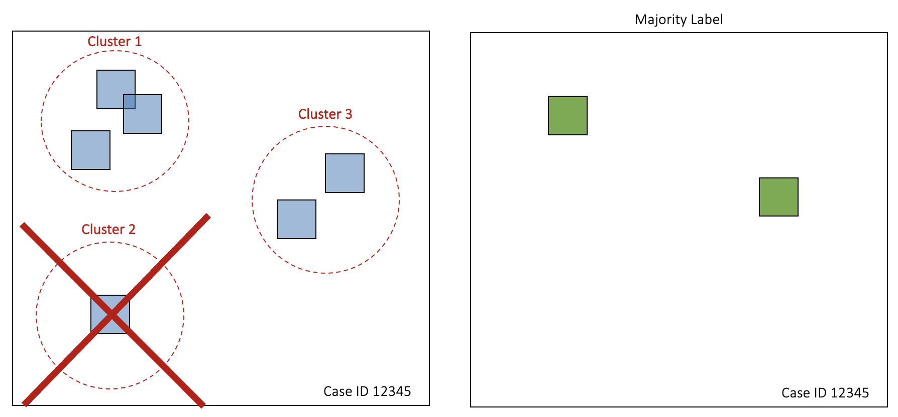 Lastly, the annotations in the remaining clusters are aggregated by averaging the coordinates of each annotation within the cluster. The resulting annotations create the Majority Label.