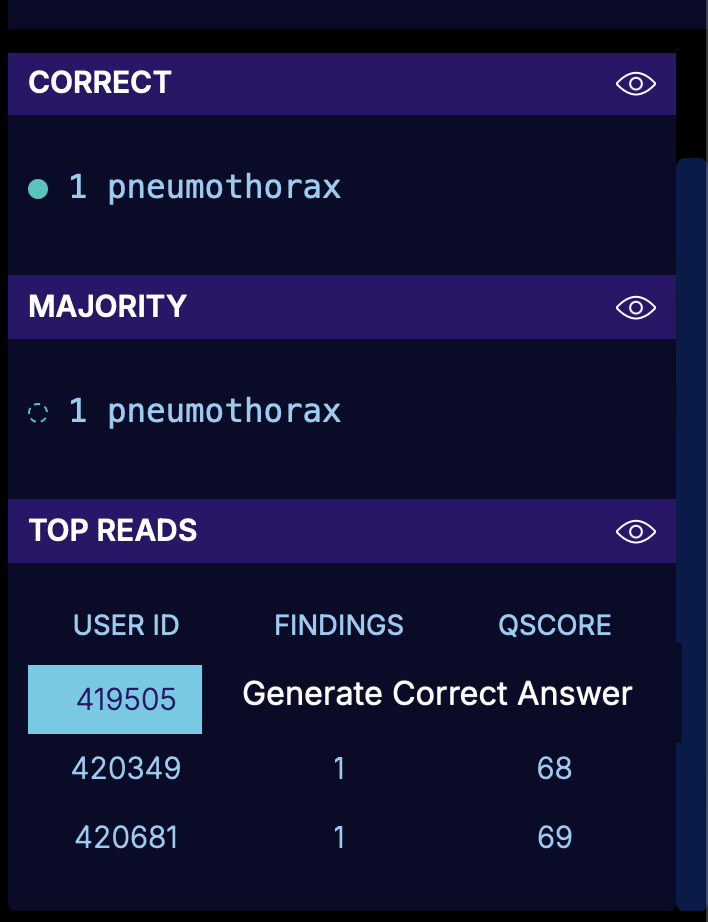 To edit previous segmentations, select the User ID of interest or Majority Label then select Generate Correct Answer. This will generate a correct answer from all findings created by that User or in the Majority Label. Then proceed to edit the segmentations further, if desired.