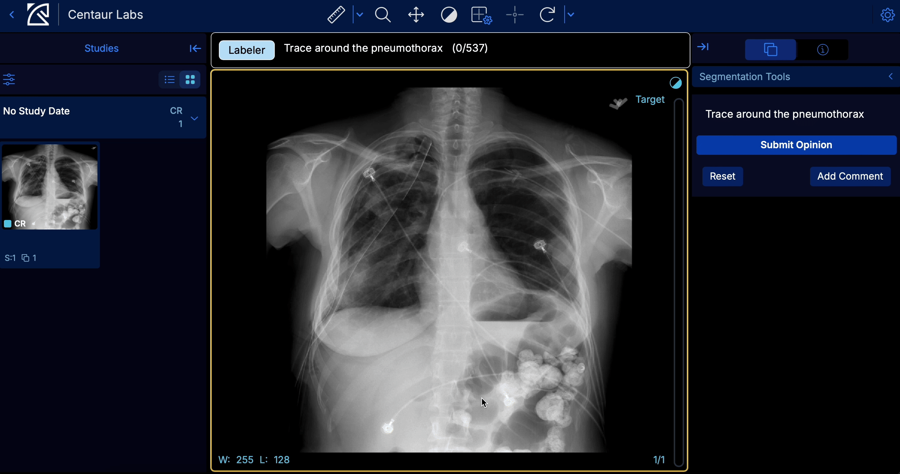 In arbitrator view, any segmentations submitted on the case are treated as the "Correct Label". Arbitrator view should only be used by a customer who is reviewing labels or by a consultant who has assumed in the role of an arbitrator. Access labeler view by going to your task, then the Cases tab, then select your case of interest and Launch DICOM Viewer.