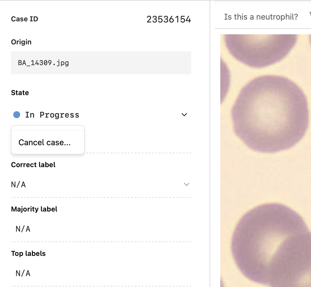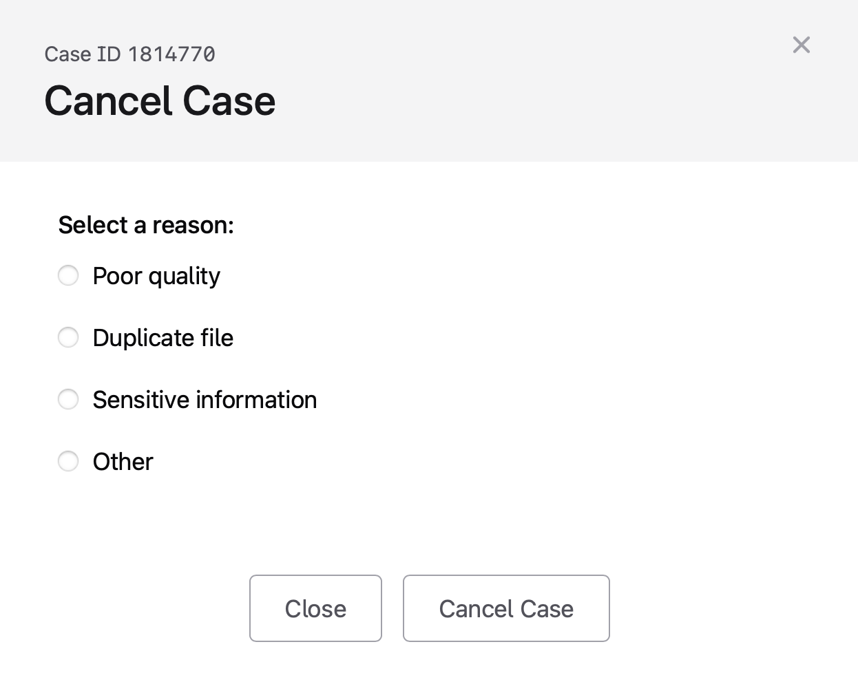 A case can be cancelled either by your team on the portal, or by Centaur. A canceled case is removed circulation and is not shown to labelers. This is a good option for cases that may be low quality, contain PHI, or do not need to be labeled for any other reason.