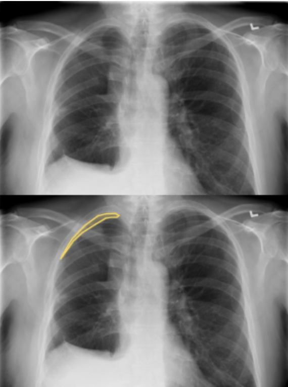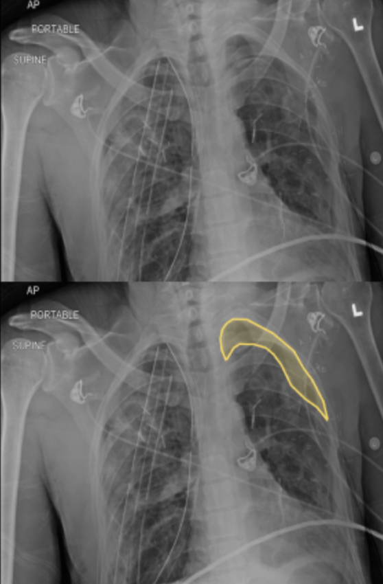 A pneumothorax is colloquially referred to as a "collapsed lung." Pneumothorax is created when the visceral and parietal pleura of a lung 🫁 are no longer are attached. Trauma, blebs (when there's too much coughing for example) or other injuries can all result in pneumothoraces. In this contest, you will be tracing pneumothoraces.