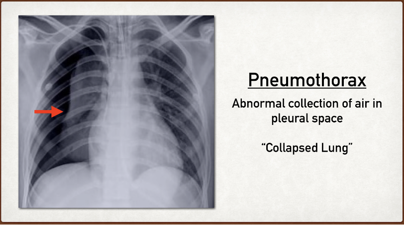 A pneumothorax is air that fills the newly created space between the visceral and parietal pleura. Look for the lack of lung lining or darker areas to make your annotation.