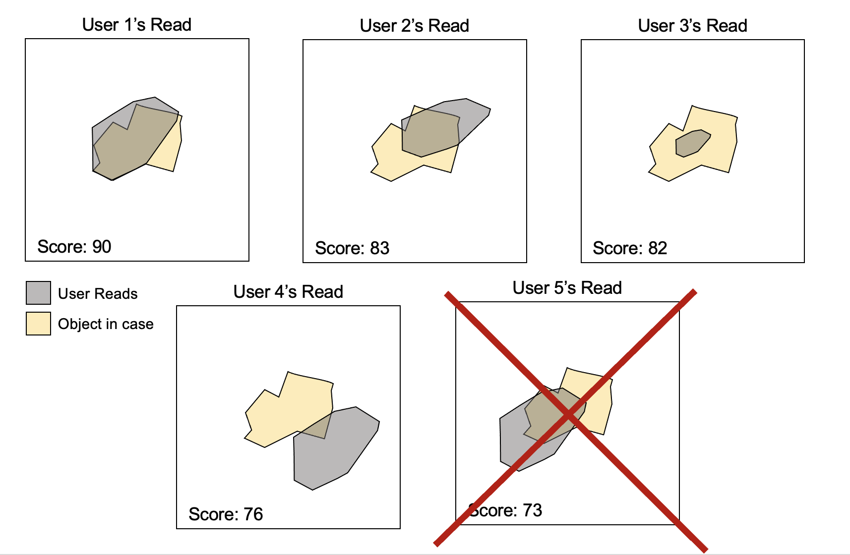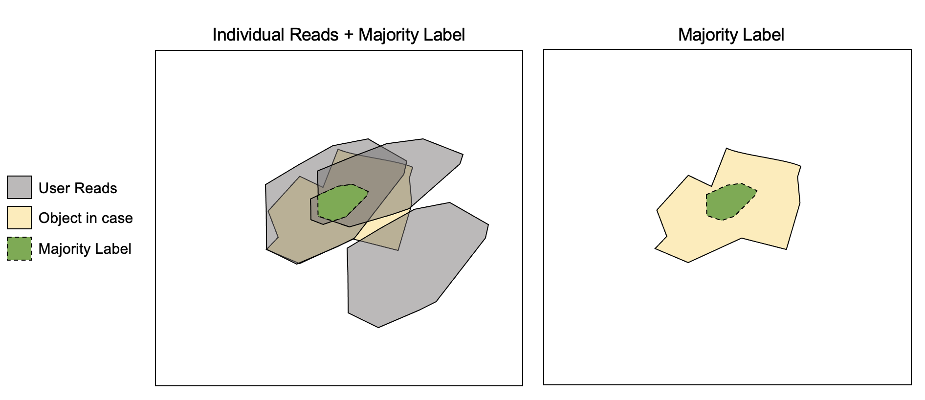 The top 4 qualified reads (based on each user’s performance on the task) will be aggregated to create the Majority Label. If 3 overlapping reads are required, any region where at least 3 of the top 4 reads overlap will be included in the Majority Label.
