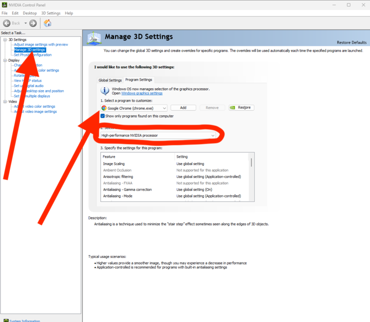 - If using NVidia, in control panel, choose High performance card for Google Chrome.